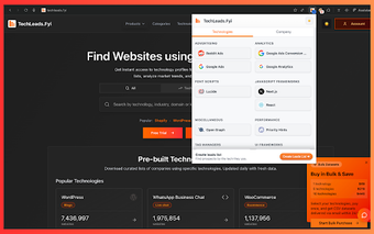 TechLeads.Fyi هو إضافة لمتصفح Chrome مصممة لتحديد التقنيات المستخدمة على المواقع الإلكترونية، مما يوفر رؤى قيمة للمستخدمين. هذه الأداة المجانية مفيدة بشكل خاص لفرق المبيعات والتسويق، مما يمكّنهم من جمع ملفات تعريف الشركات والمعلومات بالتفصيل بسلاسة. مع واجهة مستخدم سهلة الاستخدام، يتيح TechLeads.Fyi للمستخدمين تحليل المواقع بسرعة لكشف البرمجيات والتقنيات التي يستخدمونها.